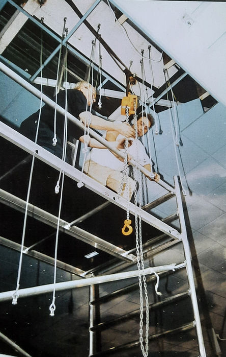 De dubbelzijdig geprinte portretten bewegen in de luchtstromen om hun as, waardoor het sculptuur op subtiele wijze zo nu en dan uit andere portretten gevormd wordt.