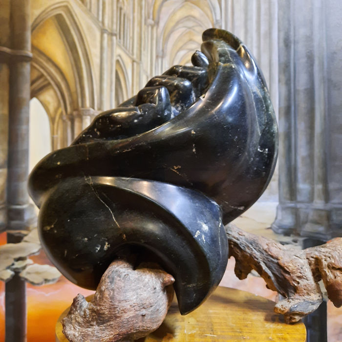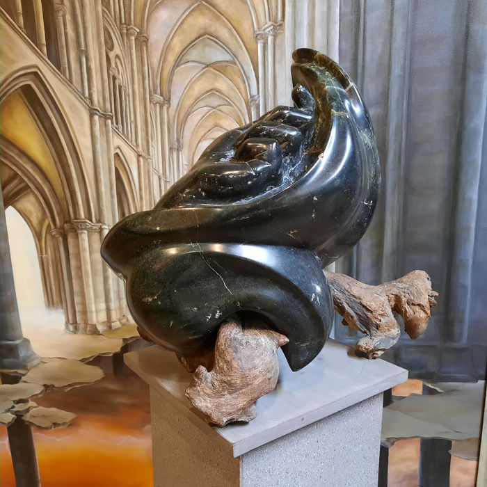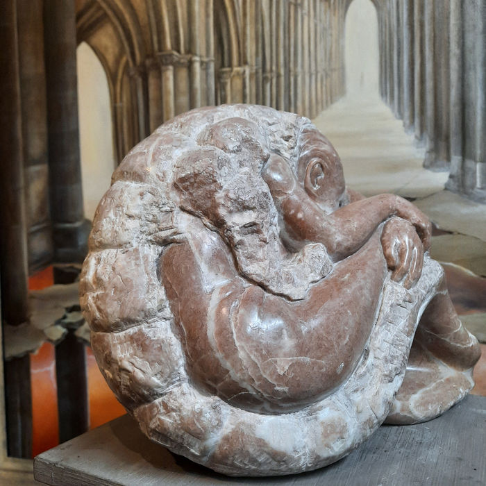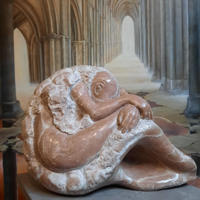 Het beeld is een combinatie van een gestileerd vormgegeven vrouw, verwerkt in een Ammoniet. De schelp vorm geeft een geborgen karakter. Hierbij zorgt het contrast tussen de uitgewerkte vrouwspersoon en de fossiele schelpvorm voor een intrigerend beeld.