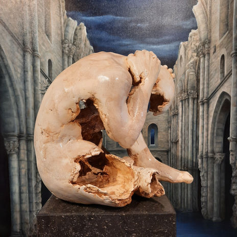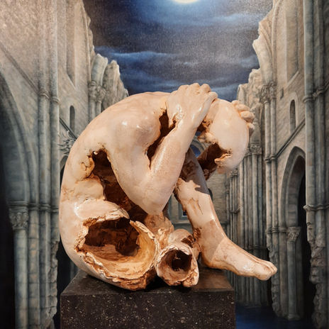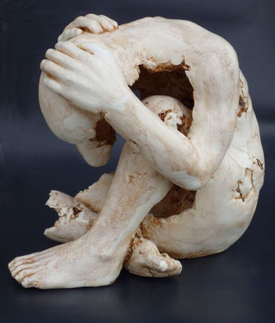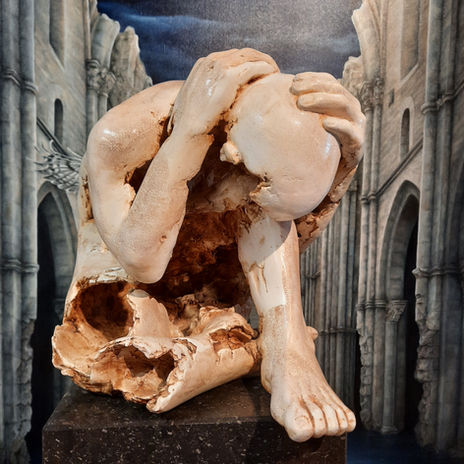 Titel: "Fading away" Materiaal: mixed media Afmeting: 45 cm hoog op hardsteen sokkel.